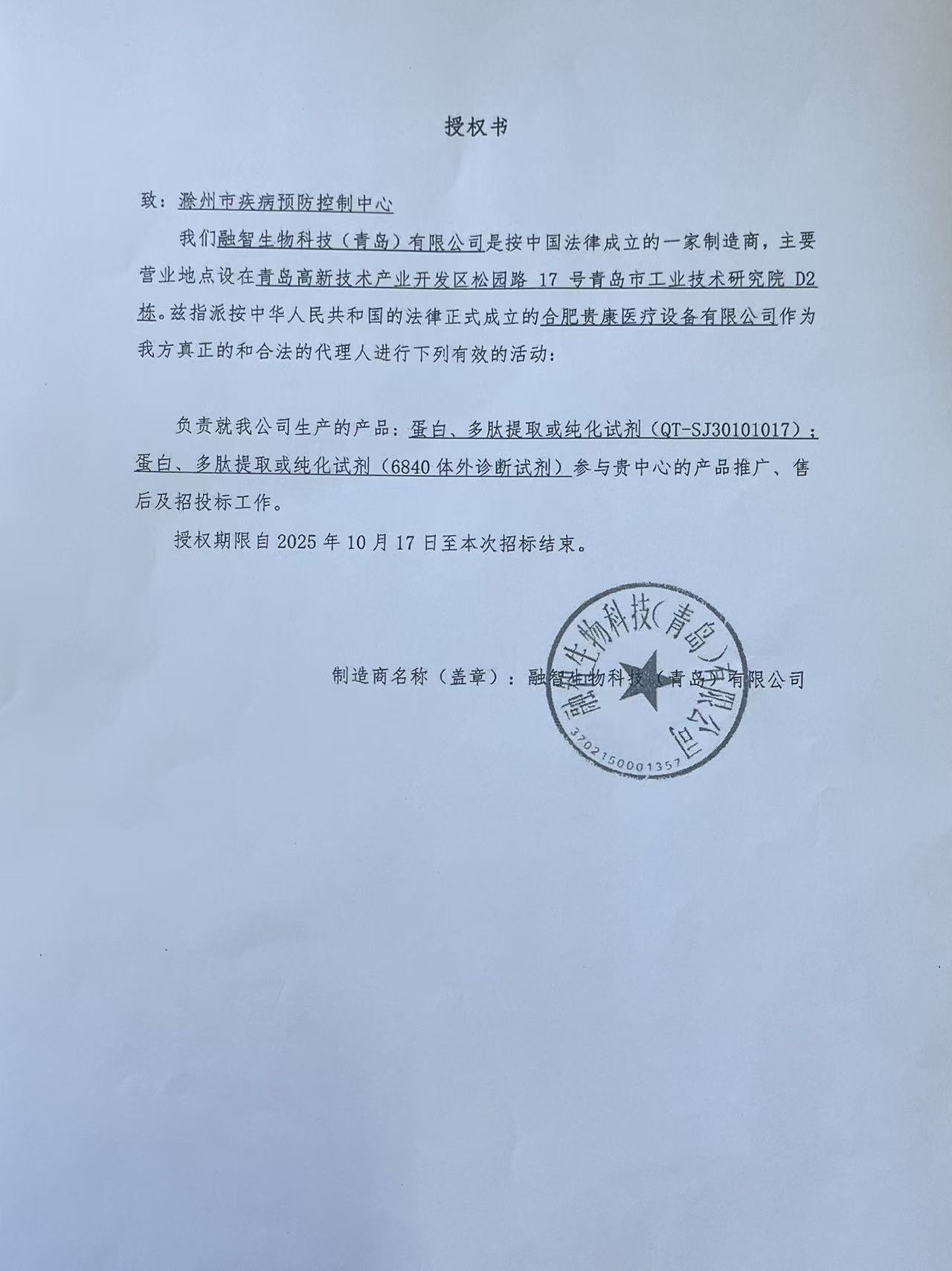 此微生物质谱鉴定试剂盒(蛋白、多肽提取纯化试剂)(QT-SJ301010176840)为设备配套专用试剂,分别用于细菌和分枝杆菌的微生物质谱鉴定,需配青岛融智微生物飞行质谱检测仪使用。合肥贵康医疗设备有限公司为融智生物科技(青岛)有限公司在滁州地区的唯一合法代理商,故拟采用单一来源方式进行采购。