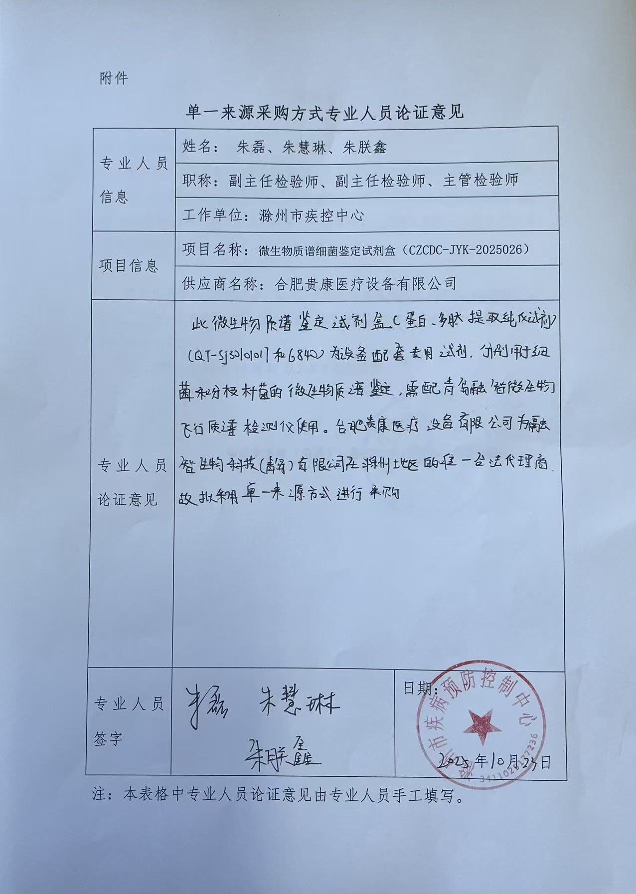 滁州市疾控中心微生物质谱鉴定试剂盒单一来源采购方式公示