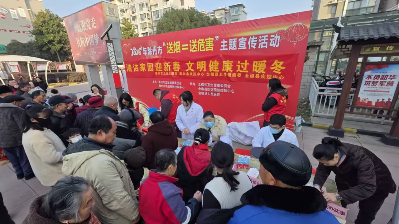 2月4日上午,由滁州市卫健委、滁州市疾控中心主办,全椒县卫健委、县疾控中心及县人民医院联合承办的2026年“送烟=送危害”控烟宣传活动,在全椒县城南居委会广场温情启幕,为辖区居民送上新年健康“大礼包”,让控烟理念深入人心。